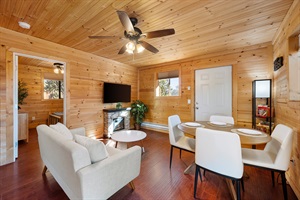 The Retreat includes three thoughtfully designed cabins, each with Smart TV, high-speed Wi-Fi, free on-site parking, and access to private outdoor wood-burning fire pit.